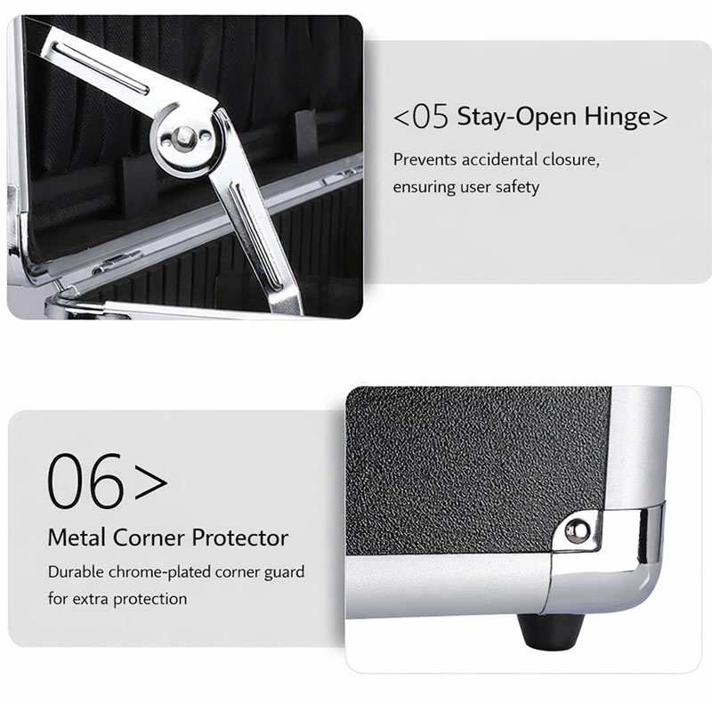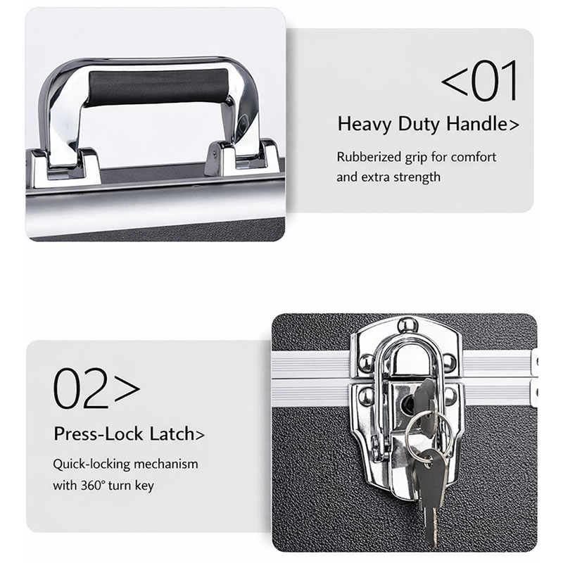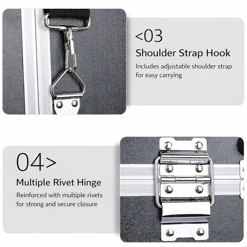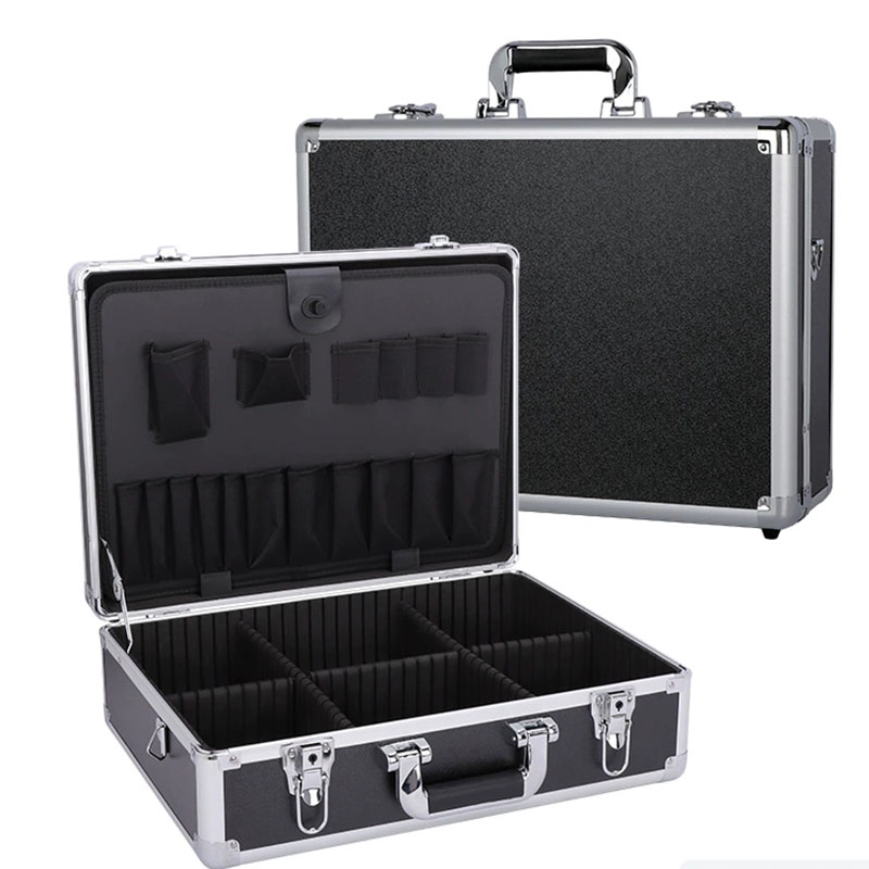 This black aluminum tool case is built with a reinforced aluminum frame and a durable exterior for reliable protection during transport and daily use. It comes with a shoulder strap, making it convenient to carry for outdoor work, maintenance, and on-site service. The lid is equipped with a tool panel with multiple small pockets, ideal for storing screwdrivers, pliers, testers, and small accessories for quick access. The bottom section features removable and adjustable dividers, allowing the interior space to be organized according to different tool sizes and types, keeping everything neat and easy to find. Size, color, and internal structure can be fully customized to meet OEM and project requirements.