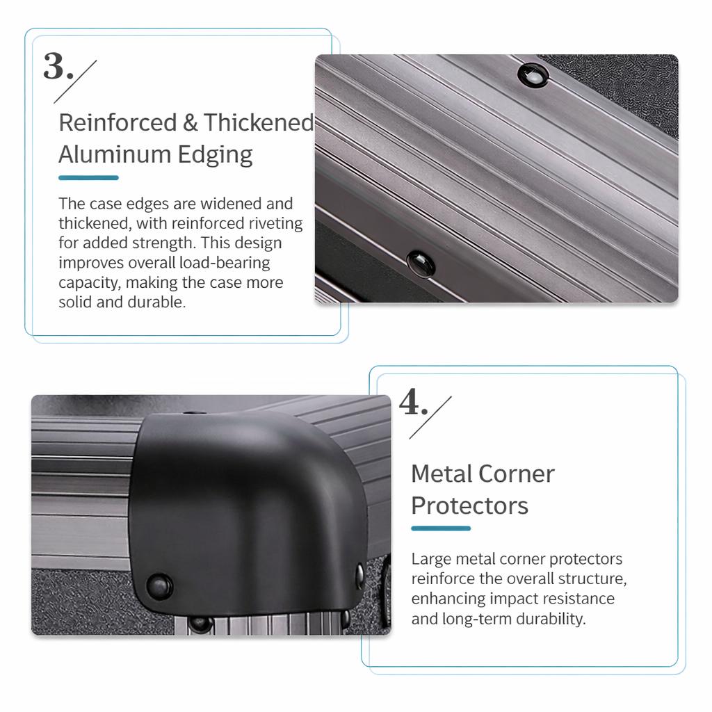 panel structure for enhanced strength and durability. The case is reinforced with metal corner protectors, providing excellent